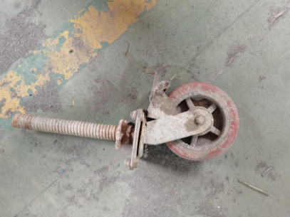 2.腳手架已經(jīng)解體,現(xiàn)場只有一塊腳手板,無扶梯(見圖2所示),腳手架少數(shù)活動鉸接處有變形(見圖3所示),4個腳手架輪散落在旁邊,處于非鎖止狀態(tài)(見圖4所示)。