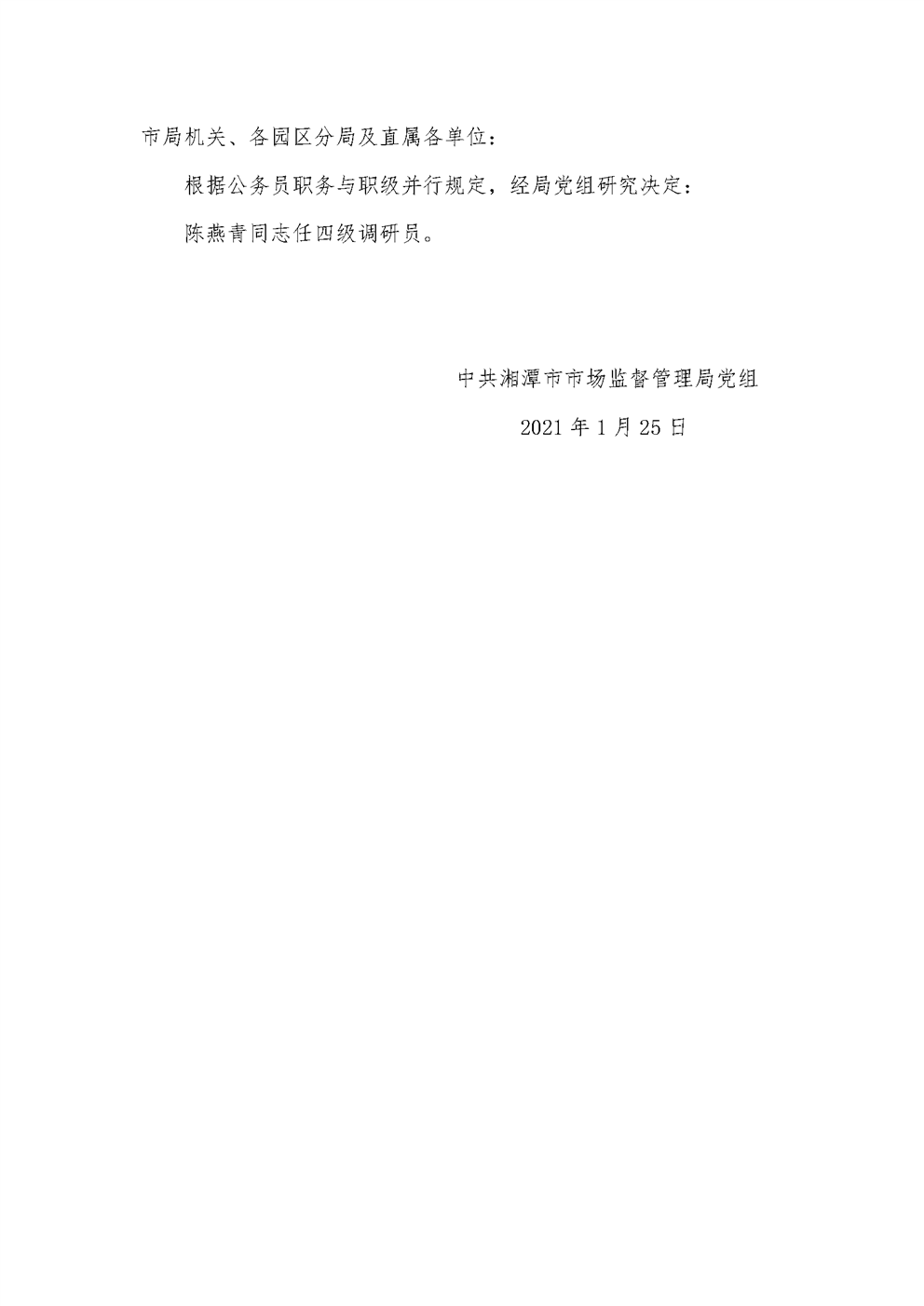 中共湘潭市市場監(jiān)督管理局黨組關(guān)于陳燕青同志職級晉升的通知