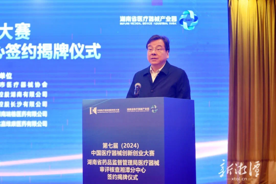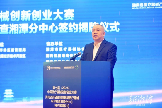 11月22日,第七屆中國醫療器械創新創業大賽暨湖南省藥品監督管理局醫療器械審評核查湘潭分中心(以下簡稱“湘潭分中心”)簽約揭牌儀式在湘潭舉行。省政協副主席、省工商聯主席、省生物醫藥及醫療器械產業鏈鏈長張健出席并講話。