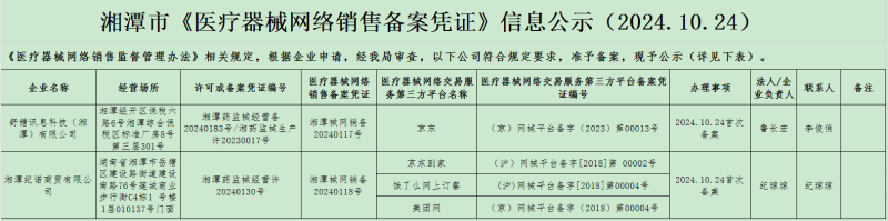湘潭市《醫療器械網絡銷售備案憑證》信息公示(2024.10.24)