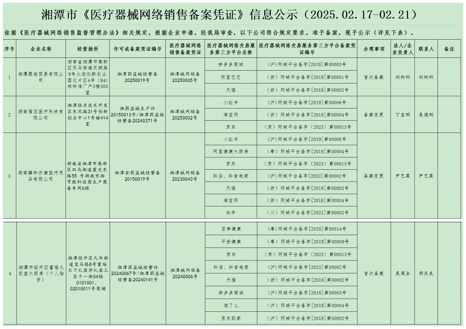 湘潭市《醫療器械網絡銷售備案憑證》信息公示(2025.02.17-02.21)