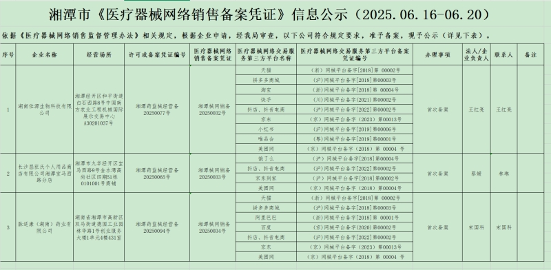 湘潭市《醫(yī)療器械網(wǎng)絡(luò)銷售備案憑證》信息公示(2025.06.23-06.27)