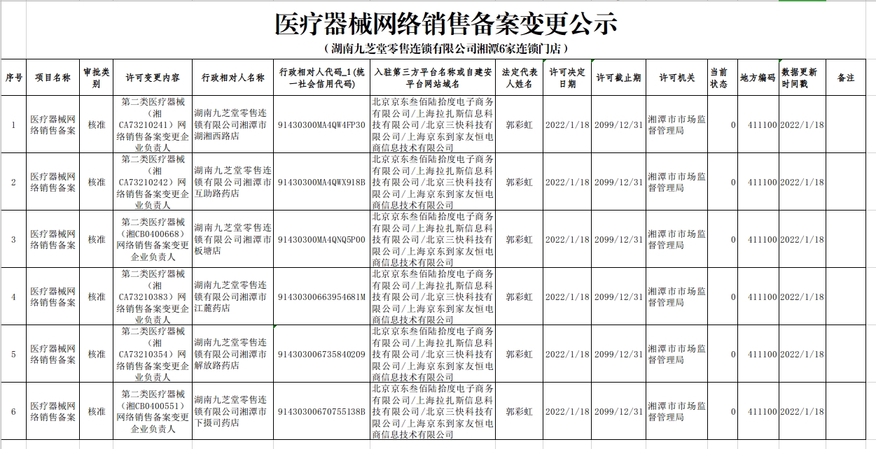 醫療器械網絡銷售備案變更公示 (湖南九芝堂零售連鎖有限公司湘潭6家連鎖門店)