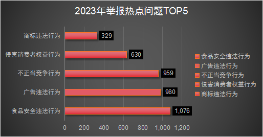從舉報問題來看,舉報量較大的問題主要有:食品安全違法行為(1076件)、廣告違法行為(980件)、不正當競爭行為(959件)、侵害消費者權益行為(630件)、商標違法行為(329件),合計占比62.44%。增長較快的問題有標準化違法行為(上升272.73%)、商標違法行為(上升242.71%)、農資違法行為(上升200%)、化妝品問題(上升150%)、特種設備違法行為(上升100%)。