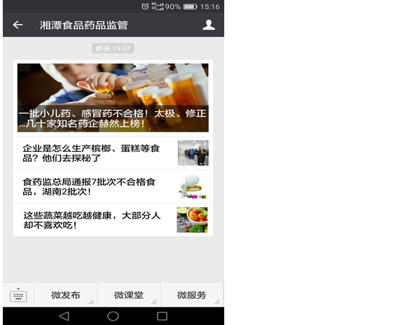 3、創(chuàng)新政務(wù)公開方式。我局除利用局門戶網(wǎng)站、政務(wù)服務(wù)中心窗口進行政務(wù)公開之外,還在湘潭在線新聞網(wǎng)開設(shè)了“湘潭食藥監(jiān)管頻道”,開通了“湘潭食品藥品監(jiān)管”微信公眾號,通過多種方式發(fā)布工作動態(tài)、安全警示、政策法規(guī)、科普知識等政務(wù)信息200多條。目前微信公眾號粉絲量為1600人,訪問量達到22000次。