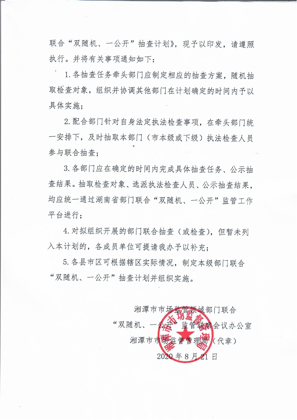 關于印發(fā)《2020年度湘潭市市場監(jiān)管領域部門聯(lián)合“雙隨機、一公開”抽查計劃》的通知